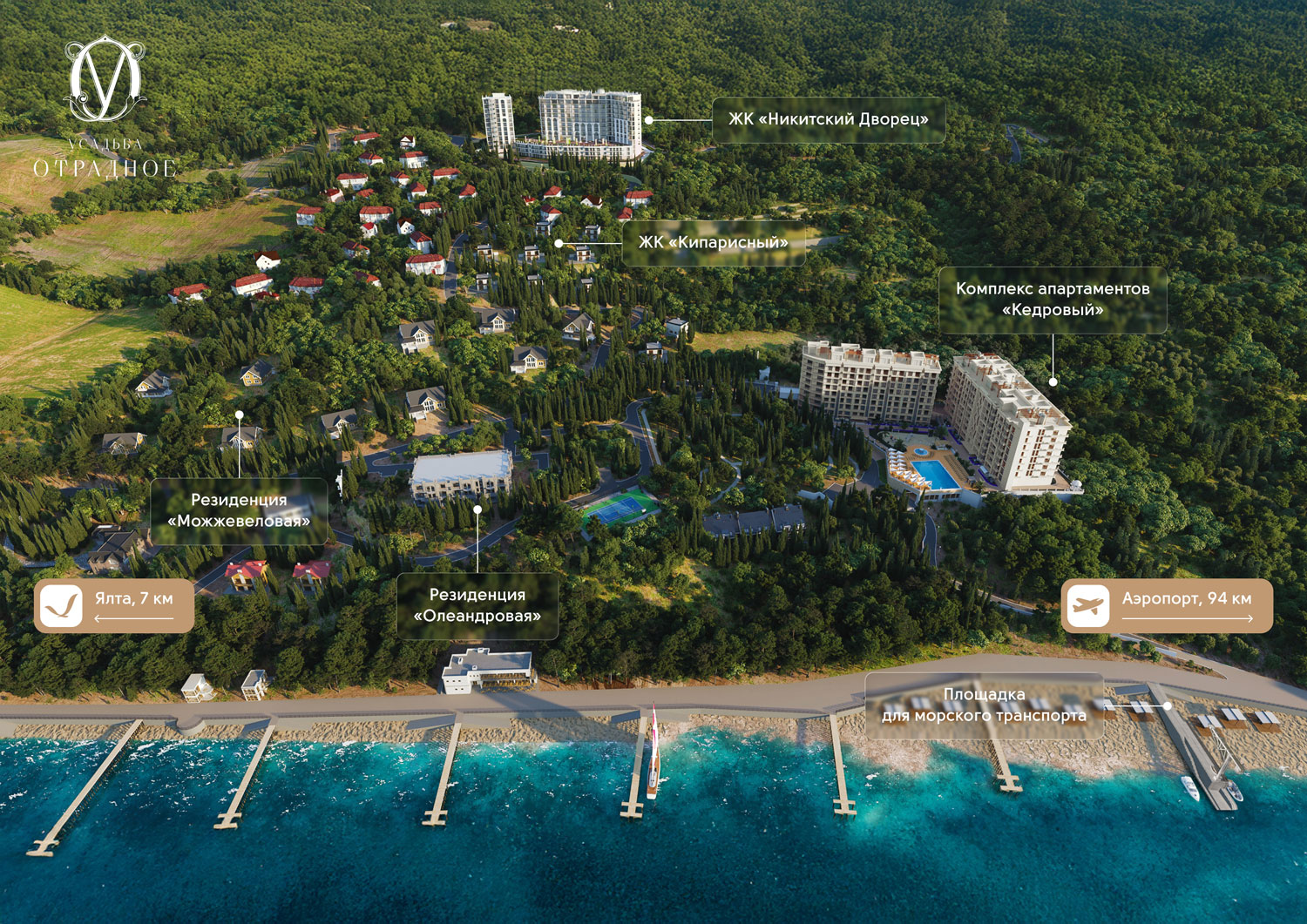 До собственного пляжа и набережной всего 80 метров. На территории: два оборудованных пляжа, теннисный корт, зоны отдыха, беседки, детские и спортивные площадки, а также для жителей открыт Никитский ботанический сад площадью 1,1 ГА.